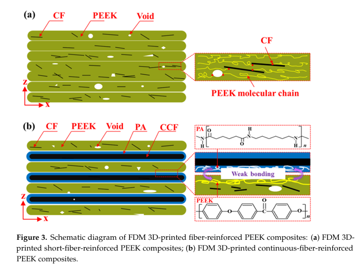 Örneğin Wang ve arkadaşları tarafından 2022 yılında yapılan çalışmada , FDM tekniği ile üretilen kısa ve sürekli fiber takviyeli PEEK kompozitlerin mekanik özelliklerini ısıl işlemle iyileştirmeyi hedeflemektedir. 150–300 °C aralığında ve 2–8 saat sürelerde yapılan deneylerde en iyi sonuç 250 °C’de 6 saatlik ısıl işlemle elde edilmiştir. Bu koşulda kısa fiber takviyeli PEEK’in interlaminer kayma dayanımı (ILSS) %16, sürekli fiber takviyeli PEEK’in ise %85 artmıştır. İyileşme; kristallenmenin artması, fiber/PEEK ara yüzey bağının güçlenmesi ve artık gerilmelerin giderilmesi ile açıklanmaktadır. Ayrıca gözeneklilik <%1’e düşmüş, boyutsal değişim sınırlı kalmıştır. Aşırı ısıl işlem (300 °C) ise polimer ve PA yapısında bozunmaya yol açmıştır. Aşağıda çalışma ile ilgili görsel bulunmaktadır [1].